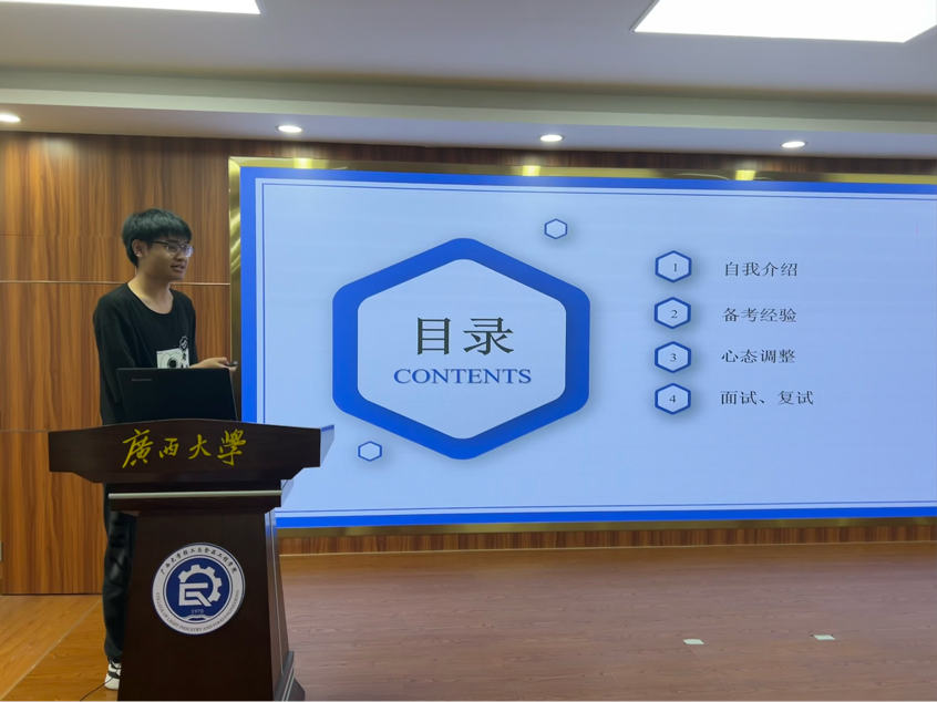 优秀共青团干部”等荣誉称号。他从推免的流程、自我定位、目标院校选择、精准定位和保研资料整理等几个方面为同学们提供了保研经验指导。