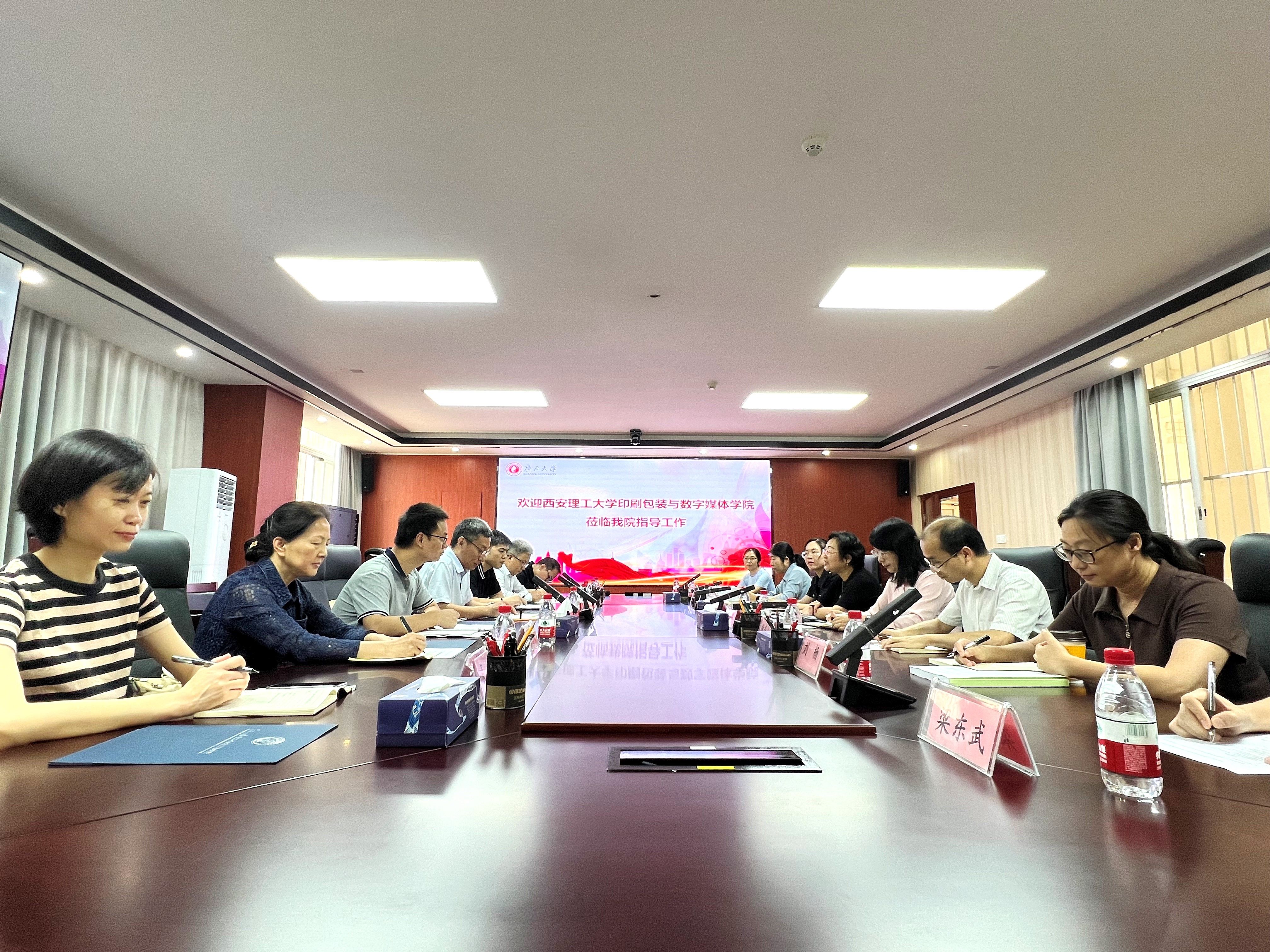 、专业建设发展历程和办学特色,希望能够深化交流合作,携手面对新挑战,为行业和社会培养合格接班人。郑元林介绍了西安理工大学印刷包装与数字媒体学院的建设发展情况,以及来校调研的目的和背景。他表示,当今社会的数字化、智能化趋势日新月异,包装与印刷学科建设的机遇与挑战并存,希望双方资源共享,共同努力围绕地域和学科特色,充分发挥各自优势,共同探索新时代包装与印刷专业教学与科研高质量发展的新路径。随后,双方教师围绕国家级一流专业、一流课程和虚拟教研室建设以及本科培养方案和教学计划等主题展开深入探讨与交流。