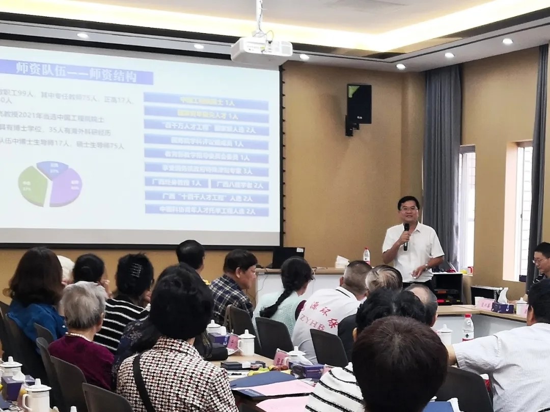 覃程荣和老前辈们共同回顾了近十年来学院各项事业的新成就,重点汇报了学院在师资队伍构建、学科专业建设、教学水平提高、科研水平提升、实验室建设、学生培养等方面的情况,并介绍了学院未来的发展规划。他表示学院的发展离不开每一位退休老前辈的辛勤耕耘,希望老前辈不断关注学院的新发展。