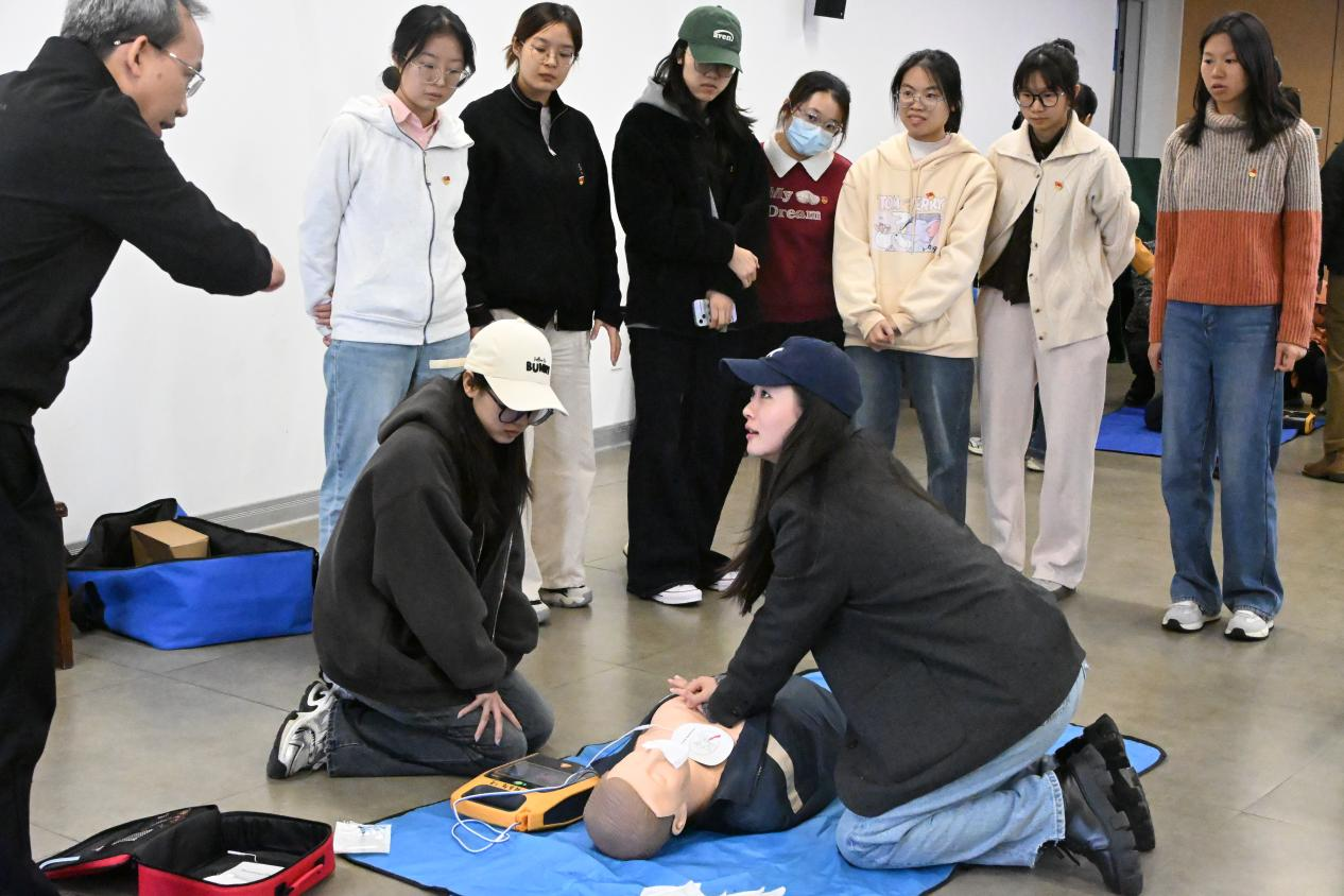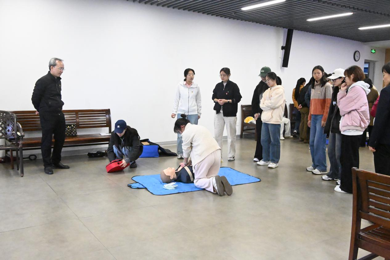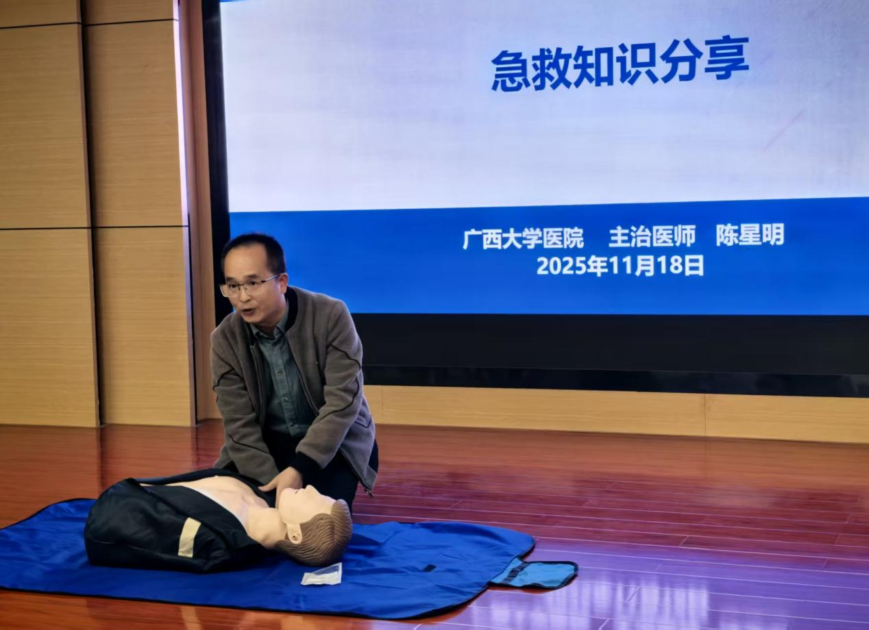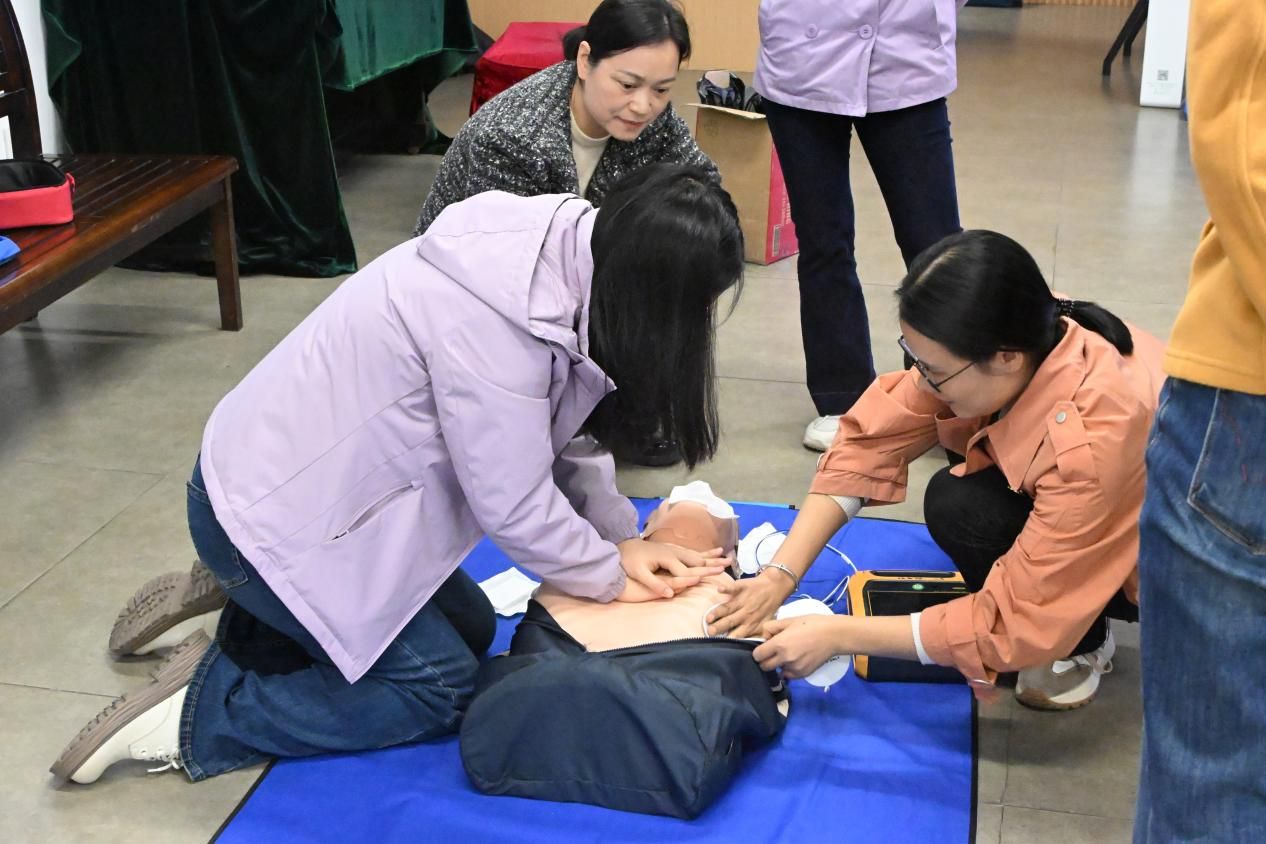 随后,全体人员前往教职工活动中心517,开展急救知识科普。活动邀请了校工会党支部党员陈星明进行授课,他结合真实案例,生动形象地讲解了心肺复苏(CPR)的操作要领、适用场景及注意事项,并介绍了AED使用方法。