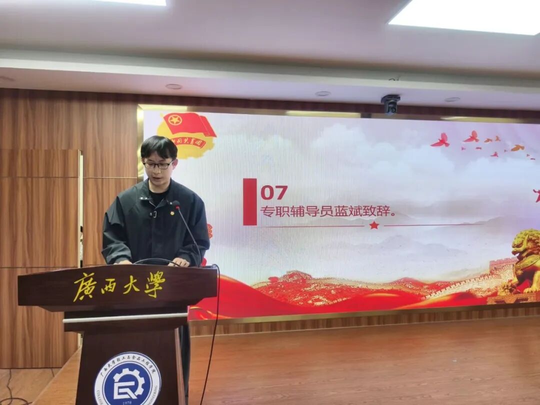 学院辅导员蓝斌老师在讲话中肯定新团员的积极表现,并提出殷切期望:团员要坚定理想信念,以入团为人生新起点,主动承担社会与集体责任,在实践中锻炼品格与能力,发扬轻工食品学子的拼搏精神,以实际行动展现新时代团员风貌。
