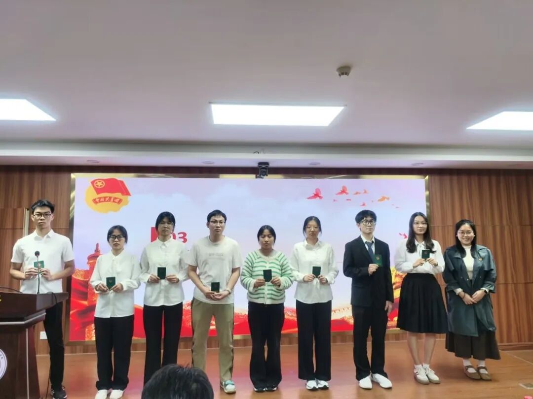 仪式在庄严的国歌声中拉开序幕,全体人员肃立致敬,以挺拔姿态传递对祖国的崇敬与热爱。辅导员曹羚彬老师宣读新团员名单,每一个名字的响起都承载着信任与责任的接力。随后,团委副书记卓能聪老师与曹羚彬老师为新团员颁发团徽、团员证,闪亮的团徽佩戴在胸前,标志着新使命的正式开启。