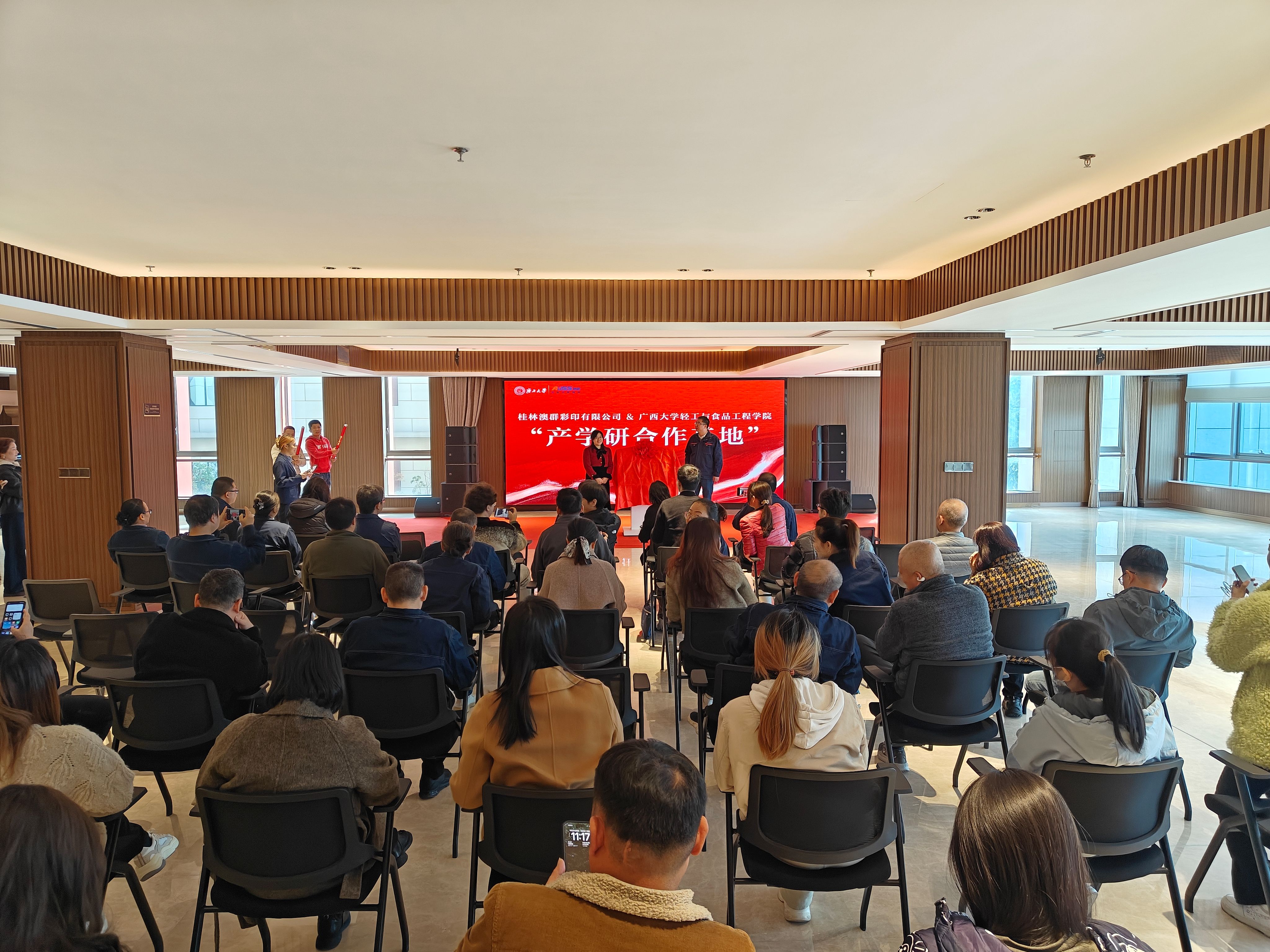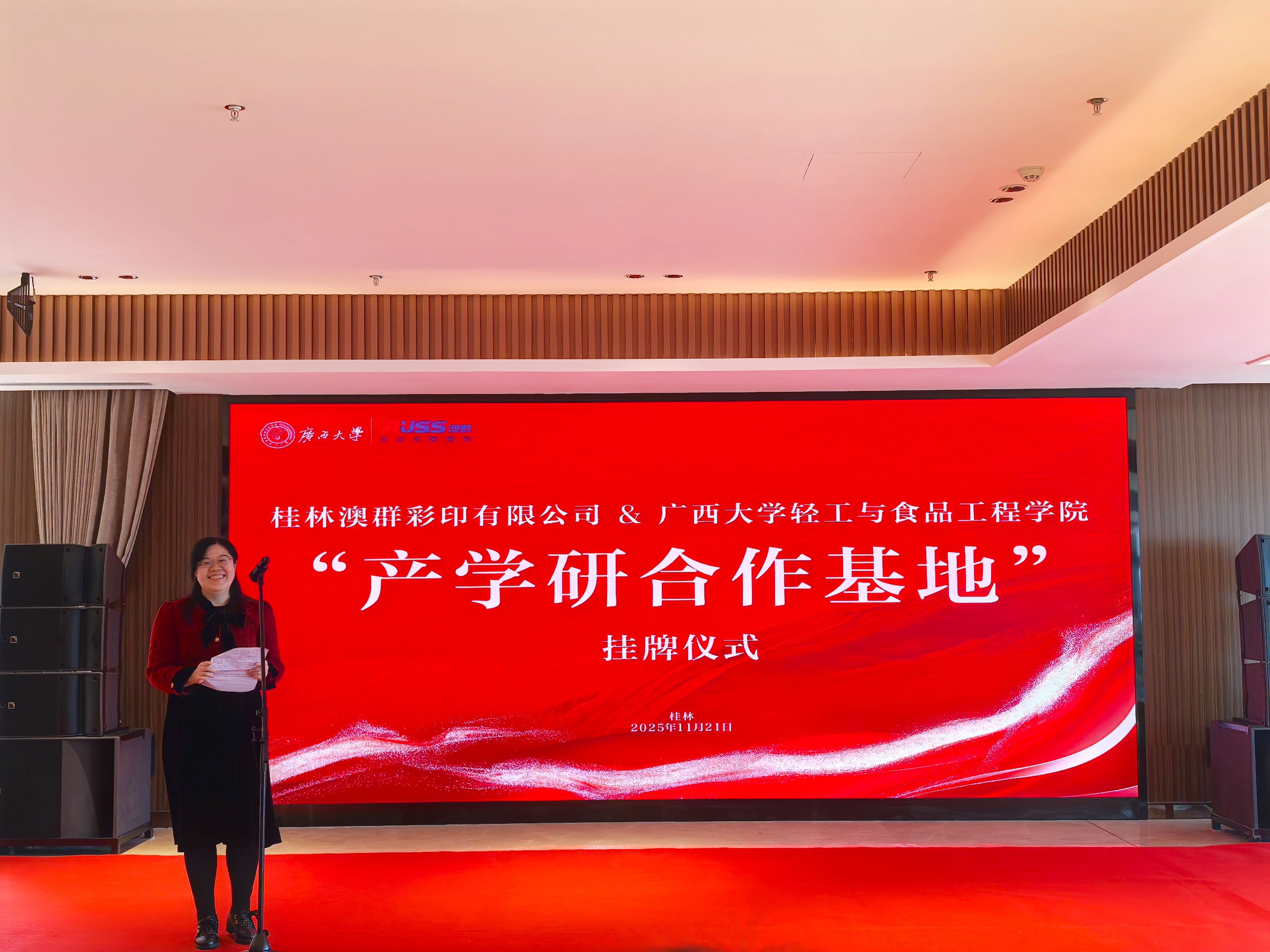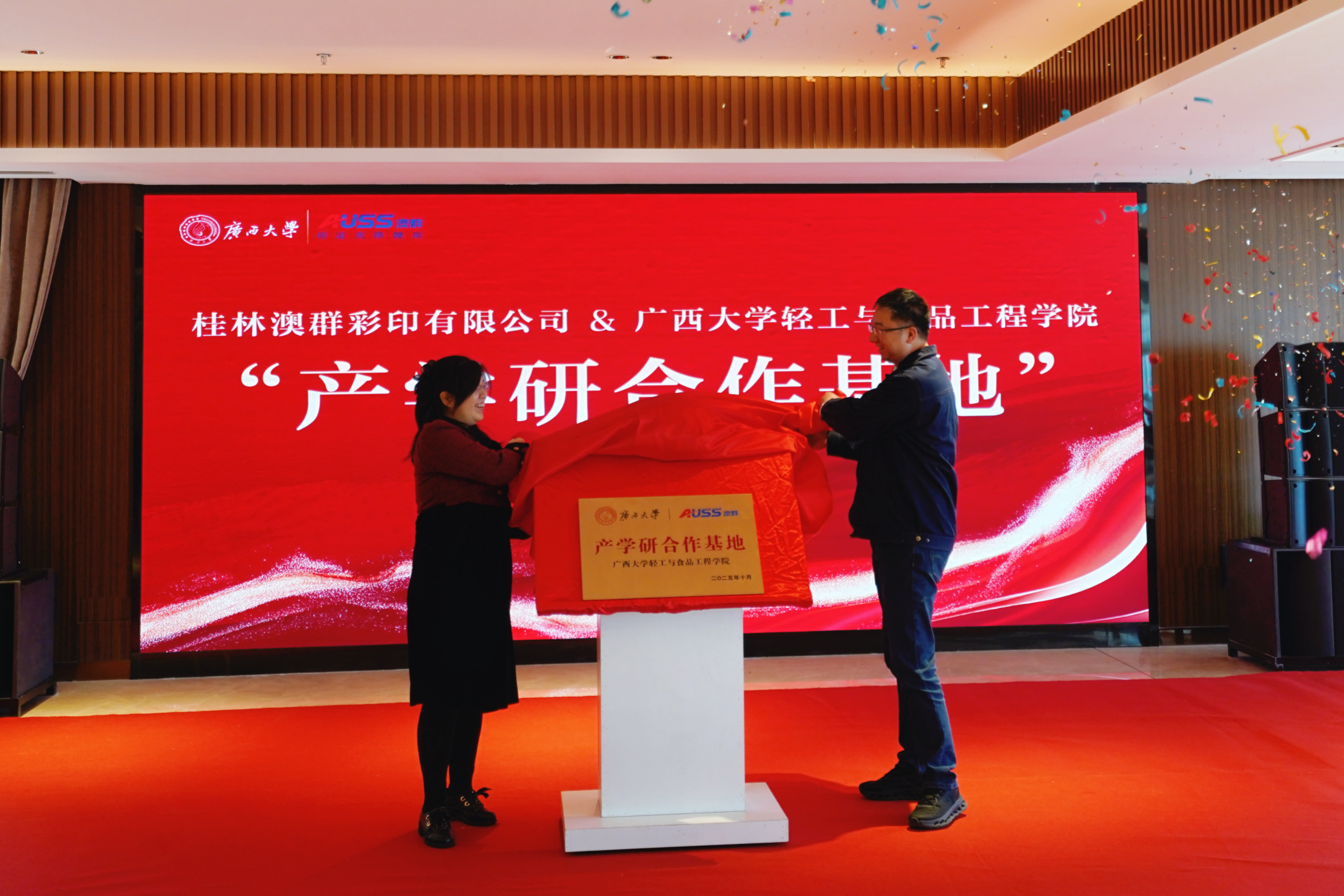 轻工学院与桂林澳群彩印有限公司产学研合作基地挂牌仪式。仪式上,桂林澳群彩印有限公司总经理覃峰与轻工学院副院长陆登俊分别致辞,并共同为双方产学研合作基地揭牌。